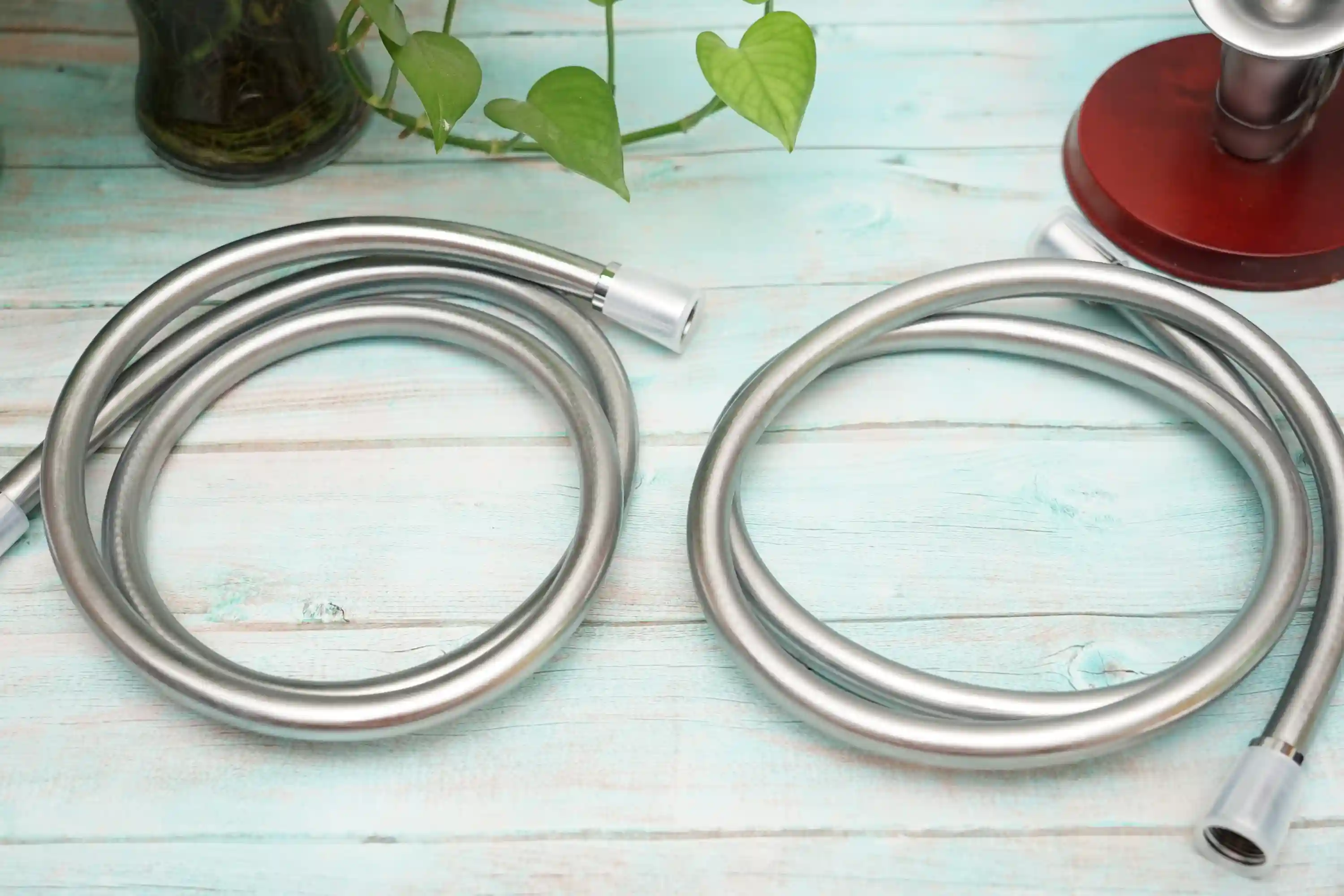 两根1.5米PVC防缠绕软管,厚实的材料增强了保温效果,还可防止热水烫伤,光滑的外壁也更容易清洁,同时还没有波纹管容易生锈和冬天触碰的冰冷,现在高端花洒都使用类似材质的软管。
