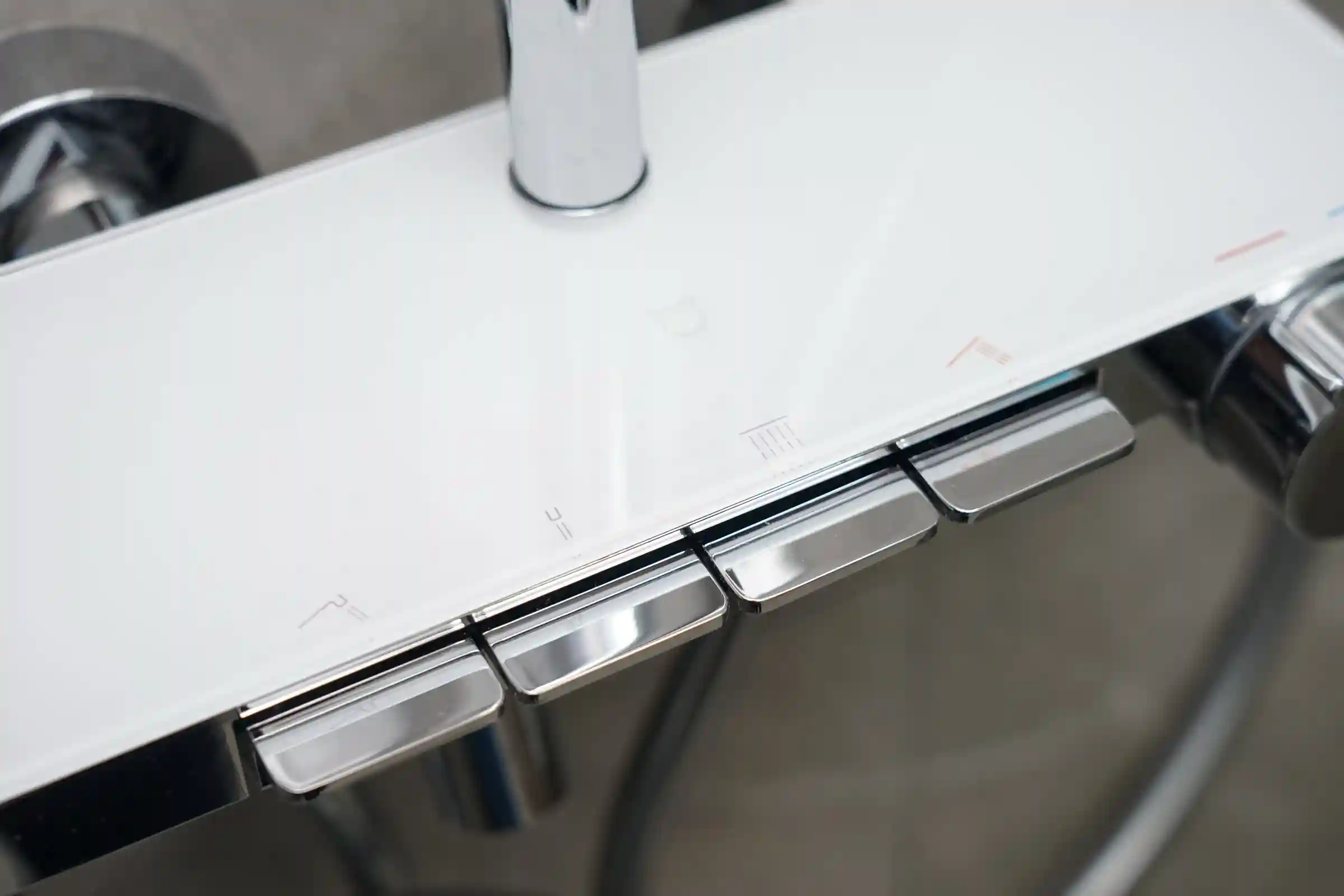 通过钢琴按键可以选择淋浴的4通道出水模式,从左到右分别是双功能手持喷枪、万向下出水、太阳花洒以及三功能手持花洒。