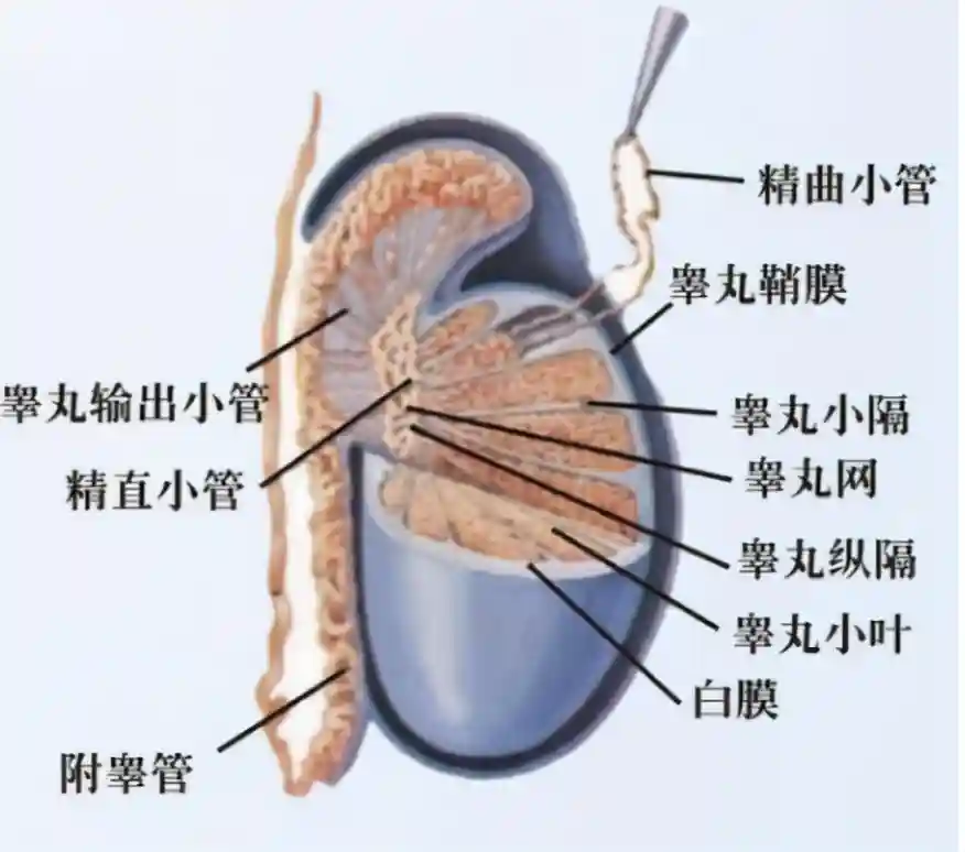 睾丸是由许多呈扇形状的睾丸小叶组成,每个小叶由数条曲细精管构成。