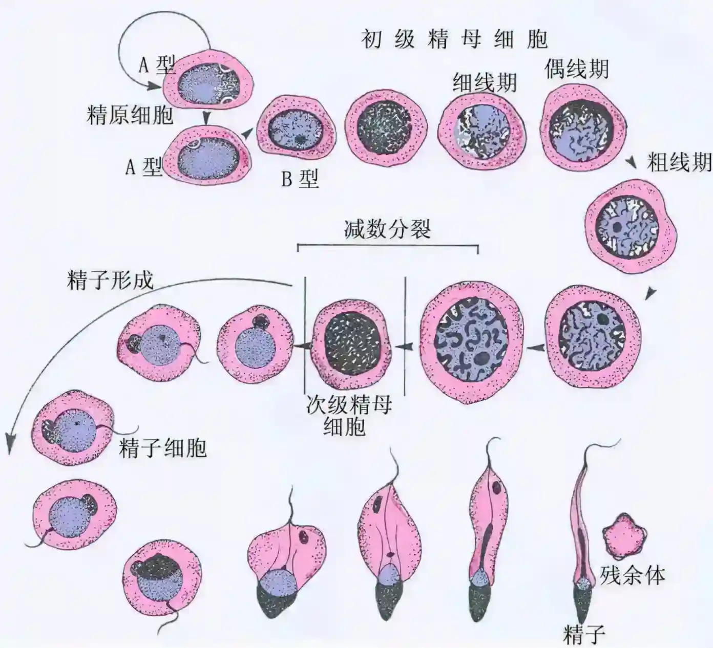 精原细胞(精原干细胞)经过无数次有丝分裂分化形成初级精母细胞;初级精母细胞经过减数分裂增殖分化形成精子细胞;精子细胞经过形态学变化,最后形成外形如蝌蚪状的精子。