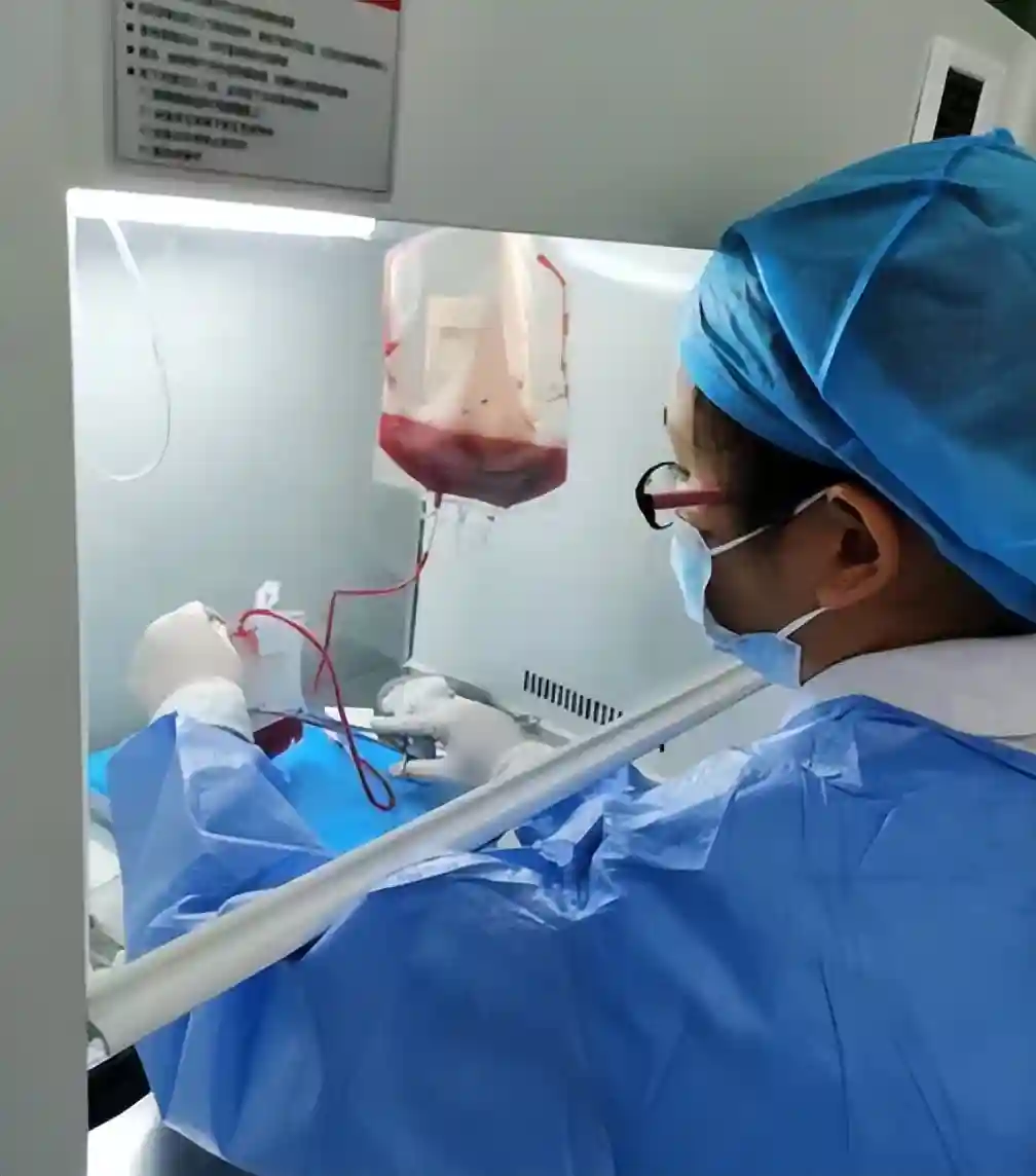 李春玲这边打了三天干细胞动员剂,在手术这天,细胞活跃度非常好,被推进手术仓采集干细胞。