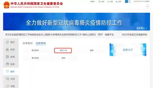 用户登录国家卫生健康委员会官网,选择“服务”-“信息查询”-“医卫人员”,通过输入省份、医生姓名、所在医疗机构,即可查询医生资质。