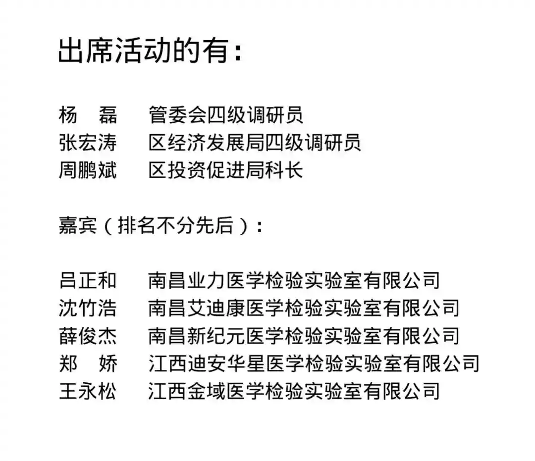 杨磊:一直以来,高新下午茶都是轻松的氛围,大家可以谈谈遇到的困难,也可以给高新区提提建议。我认为强省会必须强经济,强经济必须强产业。高新区作为南昌经济发展主战场,我们专门成立了“招商铁军”,其中就包括生物医药专班。生物医药产业作为朝阳产业,发展前景广阔,产业寿命长,高新区的生物医药产业虽有一定基础,但较航空、电子信息等产业来说有所不足。很荣幸各位企业家能够选择我们高新区,我们也想把第三方医学检验检测机构这一板块作为下一步高新区医药健康产业发展的主要细分领域,在上、中、下游一齐发力。今天请大家来,也是希望各位企业家能够站在专业角度上帮我们“把把脉”,给我们一些政策上、平台上、服务上的建议,最重要的是在企业发展方面,需要我们做些什么?下一步我们应该如何走?