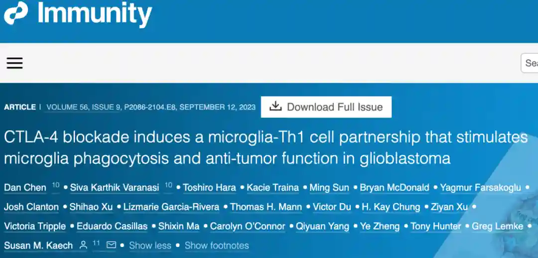 近日,相关论文以《CTLA-4阻断诱导胶质母细胞瘤中CD4+T细胞IFNγ驱动的小胶质细胞吞噬作用和抗肿瘤功能》(CTLA-4blockadeinducesCD4+TcellIFNγ-drivenmicroglialphagocytosisandanti-tumorfunctioninglioblastoma)为题在Immunity上发表[1]。