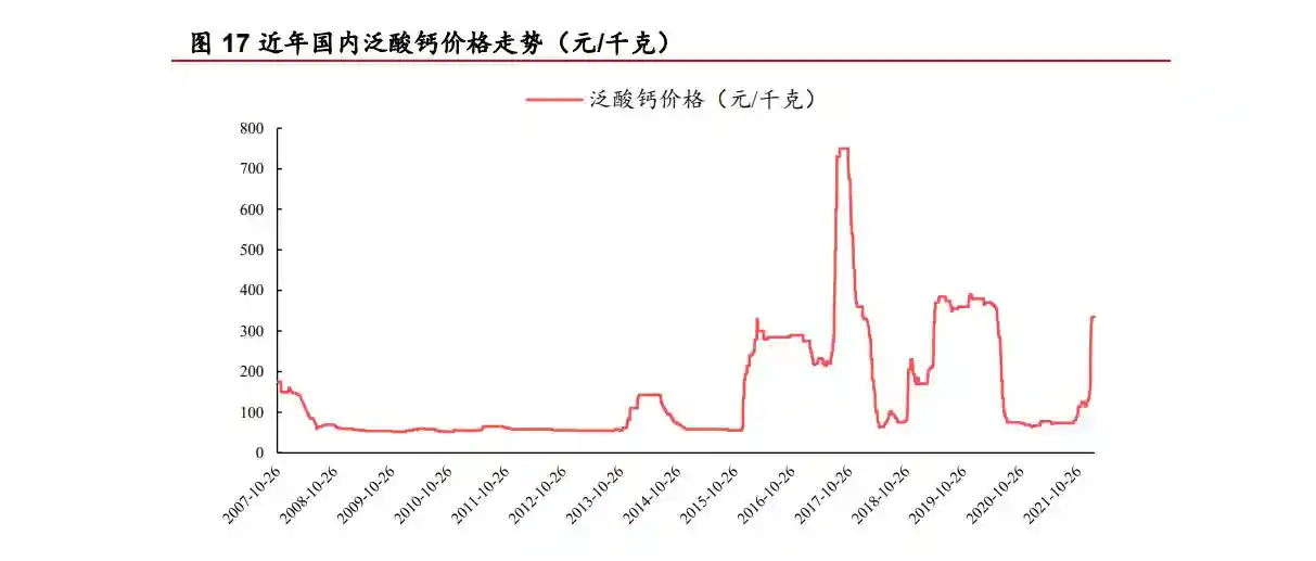 泛酸钙已进入底部回升阶段。2021年第三季度以来,泛酸钙价格处于波动周期底部向上回升阶段,据Wind数据显示,泛酸钙价格已从此前低位水平70元/千克左右攀升至150元/千克水平,增幅超100%。据饲料行业信息网,因泛解酸内酯上游原料异丁醛供应紧张、环保及冬奥会限制产能等,部分厂商提价诉求显著,已有泛酸钙厂家报价大幅上调,其中国内报价360元/公斤,出口报价50美元/公斤。产品价格进一步提升后,公司泛酸钙板块盈利也将大幅提升,有望带来亮眼表现。