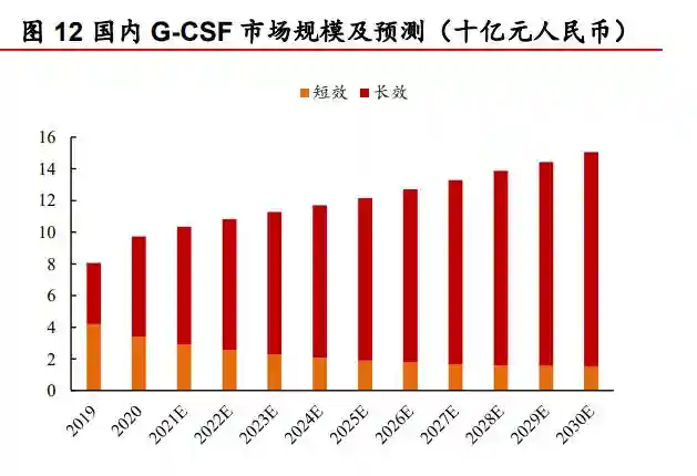 G-CSF类药物保持快速增长,长效制剂占主导。根据弗若斯特沙利文预测,2020年,我国已上市的G-CSF类药物总收入约为97.31亿元,其中长效产品的销售额为63.29亿元,长效制剂市场份额超过70%。在我国癌症新发患者数量不断上升的背景下,长效G-CSF类药物作为癌症患者化疗后升白刚需用药,其市场规模有望进一步。长效G-CSF类药物在2025年预计达到102.70亿元的销售规模,在2030年将达到135.37亿元,CAGR约8%。