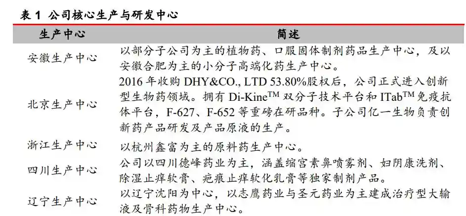 经过整合发展,公司已形成以北京、上海为主的大分子生物药研发、生产中心,以安徽为主的小分子高端化药、植物药生产中心,以四川为主的皮肤药、妇科药生产中心,以辽宁为主的骨科药、治疗型大输液生产中心及以浙江为主的原料药生产中心。