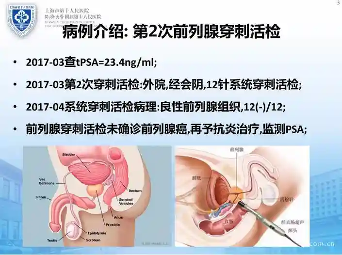1.真实的患者故事:第1次前列腺系统穿刺活检为阴性55岁的老严在2016年11月体检时发现了前列腺特异抗原(PSA)升高至23ng/ml。为了排除前列腺癌,老严接受了前列腺系统穿刺活检,穿刺12针的结果均是良性前列腺增生。医生要求老严定期检测PSA。