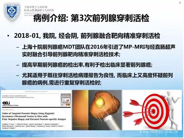究其原因是目前的前列腺穿刺活检仍以系统穿刺活检为主。系统穿刺活检最大缺点是其针对整个前列腺进行多针数的“盲穿”。这就如同射箭没有靶标一样!因此,系统穿刺活检准确率比较低。多参数核磁共振检查是目前诊断前列腺癌的最佳影像学技术,其优势在于灵敏度和特异度高,可以精准定位可疑前列腺癌靶病灶。经直肠超声前列腺检查简便易行,可以对前列腺穿刺活检进行实习引导和观察,保证穿刺的安全性和成功率。在前列腺癌多学科团队的协作下,将二者结合起来,就能形成实时融合图像,以达到对前列腺癌靶病灶的精准穿刺。这就如同射箭一样,靶向穿刺活检能最大可能地保证穿刺到靶标。上海十院前列腺癌MDT团队在2016年引进了多参数核磁共振与经直肠超声实时融合引导下经会阴前列腺靶向精准穿刺活检技术。目前,该项技术已成为上海十院前列腺癌MDT团队的优势与领先技术常,已经为多位经历过2-3次系统穿刺阴性却又怀疑前列腺癌的患者明确了前列腺癌的诊断。