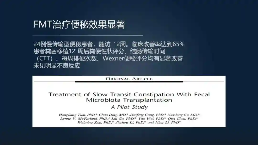 说到便秘微生态治疗,首先我们都会想到粪菌移植,确实粪菌移植可以将健康人的粪便中的一个功能菌群移植到患者胃肠道内,同时重建具有正常功能的肠道菌群,实现肠道与肠道外疾病的一个诊疗。