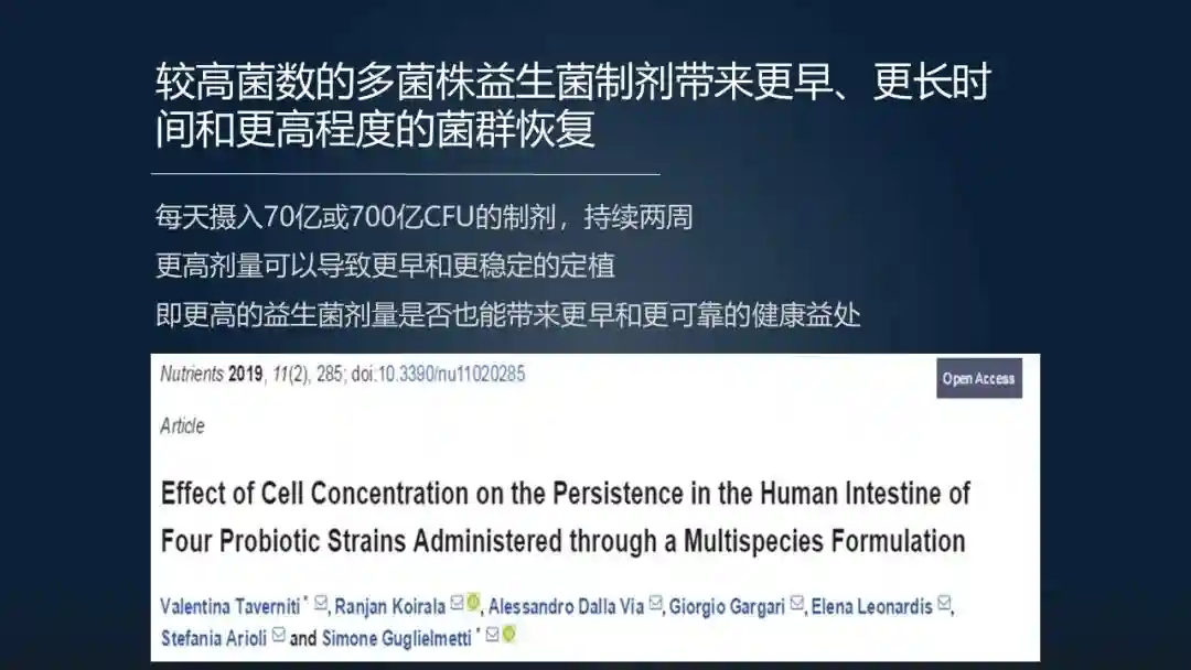 这里有篇文章就提出了每天摄入70亿或者700亿的一个肠道微生态制剂,持续两周,发现较高菌数和多菌种益生菌制剂往往可以带来更早和更高程度的一个菌群恢复。
