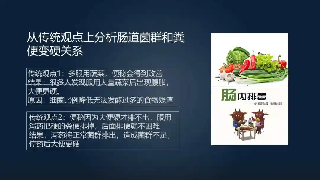 第二种观点就是说我们便秘是因为大便硬,我们才排不出来的,我们服用一些泻剂把过硬的粪便排掉,后面排便就不困难了。但是结果是我们在服用泻药的情况下,除了粪便被排出,正常的菌群也出现排出,造成菌群不足。一旦我们停用这些泻剂,排便以后大便会更加硬,出现一个恶性循环。