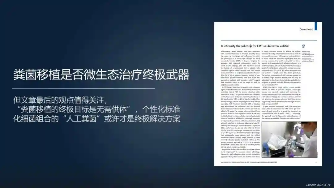 这是2017年的《柳叶刀》的一篇综述。这篇综述里面它最后提到的一个观点就是说粪菌移植的终极目标是无需供体。什么叫无需供体?就是一个个性化、标准化的细菌组合。人工粪菌或许才是一个终极解决的方案。