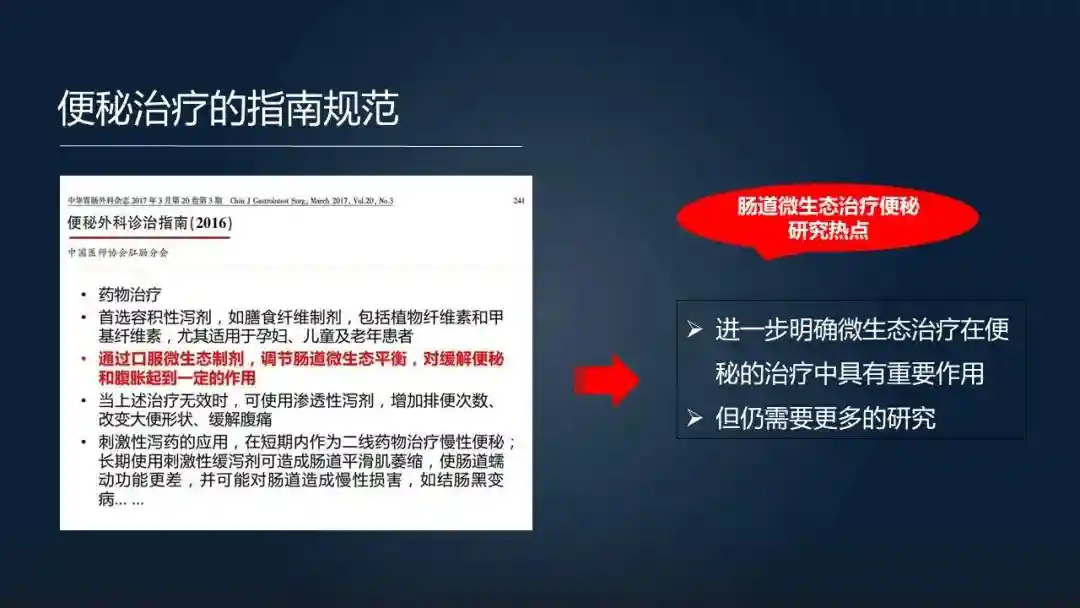 这是2016年的《便秘外科诊治指南》,它已经提出了经过口服肠道微生态制剂调节肠道微生态平衡对缓解便秘和腹胀起到了一定的作用,但是我们要进一步明确微生态治疗在便秘治疗中的一个重要作用。