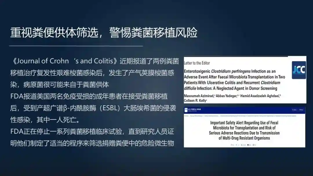 FDA也报道了美国两名免疫受损的成年患者进行粪菌移植后,由于相关的耐药菌的感染,导致其中一人死亡。而且FDA正在停止一系列的粪菌移植临床试验,直到他们制定了相关的一个程序来筛选捐赠粪便中的一个危险微生物。