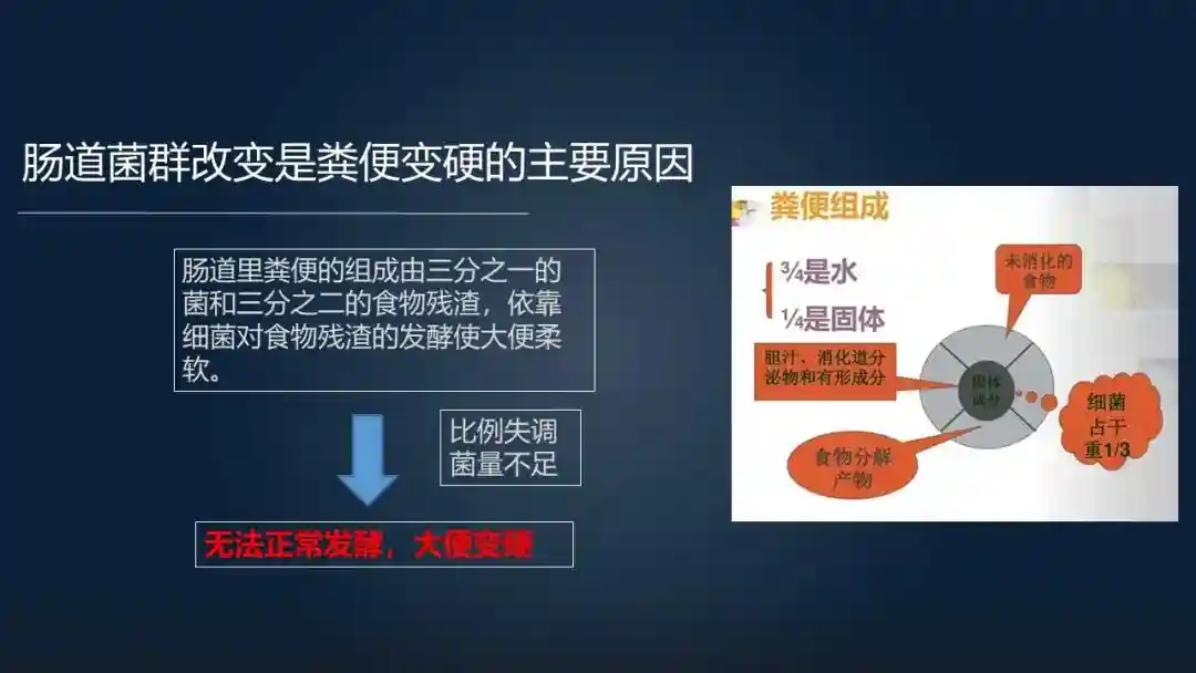 其实我们肠道里面的粪便的组成,1/3是菌,2/3是食物残渣。我们往往依靠肠道菌群对食物残渣的发酵使大便变软,但是工作压力或者生活习惯不良都可以造成一个人肠道的菌群不足,而无法正常发酵可以导致我们的粪便变硬。