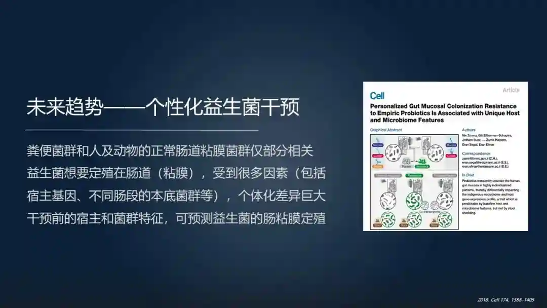 这是2018年Cell上的一篇文章。有人提出了未来趋势是进行个性化的益生菌干预,但是使用益生菌要定植在肠道也受到很多因素的影响,包括我们宿主的基因、不同肠道的原籍菌,它的个体化差异是巨大的。而且,在干预前的宿主的菌群特征可以预测益生菌的肠道粘膜定植的效果。
