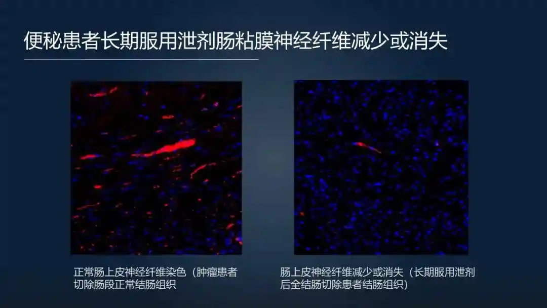 同时我们对便秘患者和正常人的神经纤维做了个对比。我们将正常患者和长期服用泻剂的便秘患者他的肠道组织进行了对比,我们发现正常人的肠道上皮神经纤维染色可以发现有非常多的神经纤维,但是对于便秘患者他的神经纤维是明显减少的。