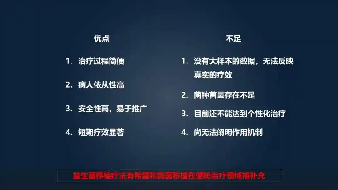 但它也存在不足之处:它没有大样本的数据,它也无法反映真实疗效;第二个就是说,它的菌种菌量和粪菌移植比还是存在不足,目前还不能达到一个个性化治疗;而且它也没有办法阐明它的作用机制。