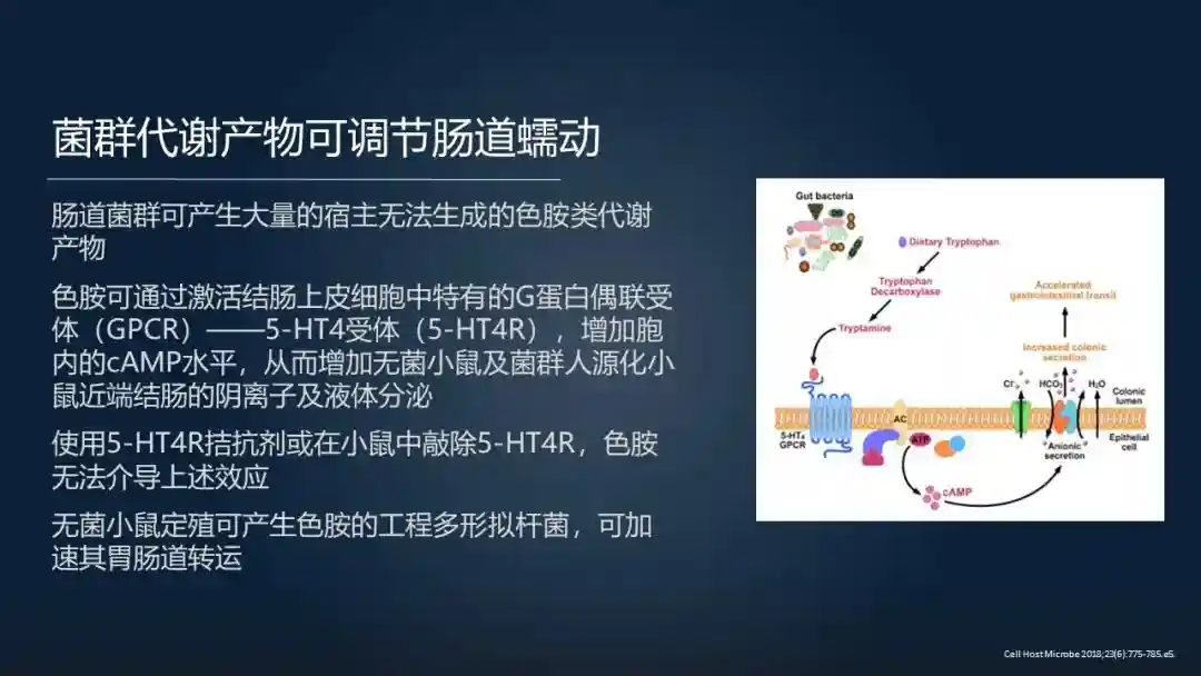 而这些色胺可以通过激活结肠上皮的一种特有的相关的受体,包括五羟色胺受体,可以增加无菌小鼠以及菌群人源化小鼠的结肠里面的阴离子和液体的分泌。