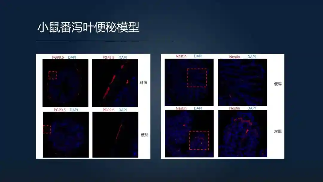 左面我们可以看到便秘患者肠神经纤维出现明显的一个减少,右边我们可以看到这个相关的神经干细胞NESTIN小体,便秘组和对照组也出现了明显的一个差异。