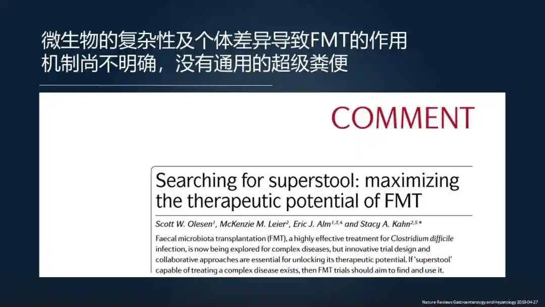 首先这篇关于如何优化粪菌移植的文章里面,他就提出了由于肠道微生物它的复杂性和每个人的个体差异,导致粪菌移植的作用、机制目前还没法明确。同时,他也提出没有通用的超级粪便,不是所有的毛病都可以通过粪菌移植来解决。