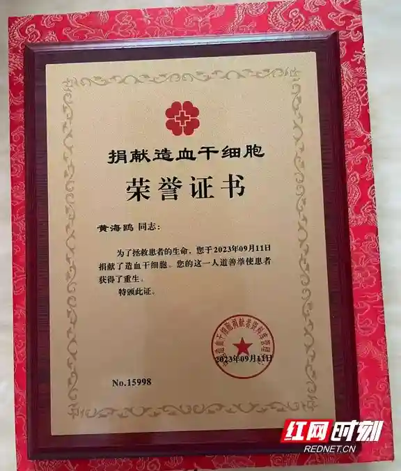 红网时刻新闻9月14(通讯员张雅斯)2023年9月11日,白衣天使黄海鸥在中南大学湘雅医院经过6个多小时的机采,成功捐献造血干细胞300毫升,成为静河镇首位,也是今年湘阴的第一位造血干细胞捐献者!