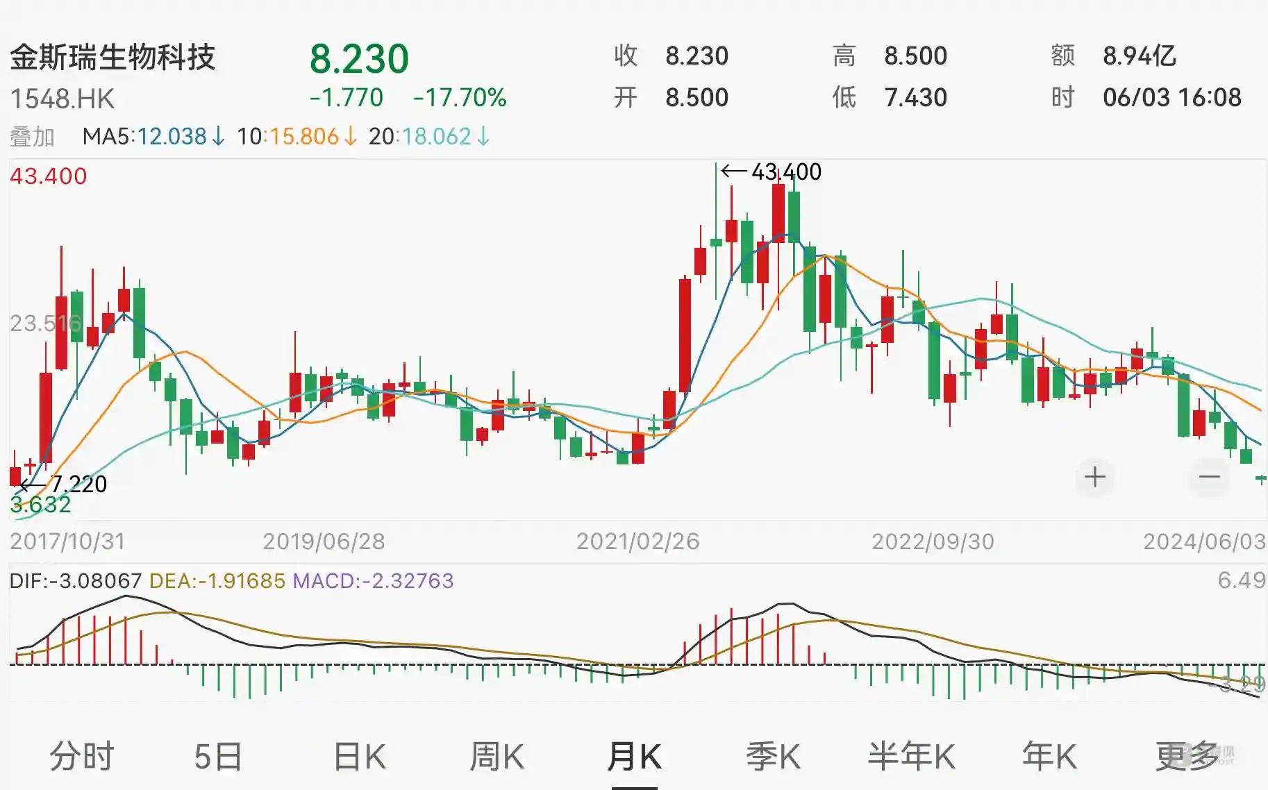 6月3日,港股公司金斯瑞生物科技(01548.HK,以下简称“金斯瑞”)股价出现异动,开盘后一度跌超25%,报7.43港元,创下自2017年10月以来的阶段性新低,而后略有回弹。