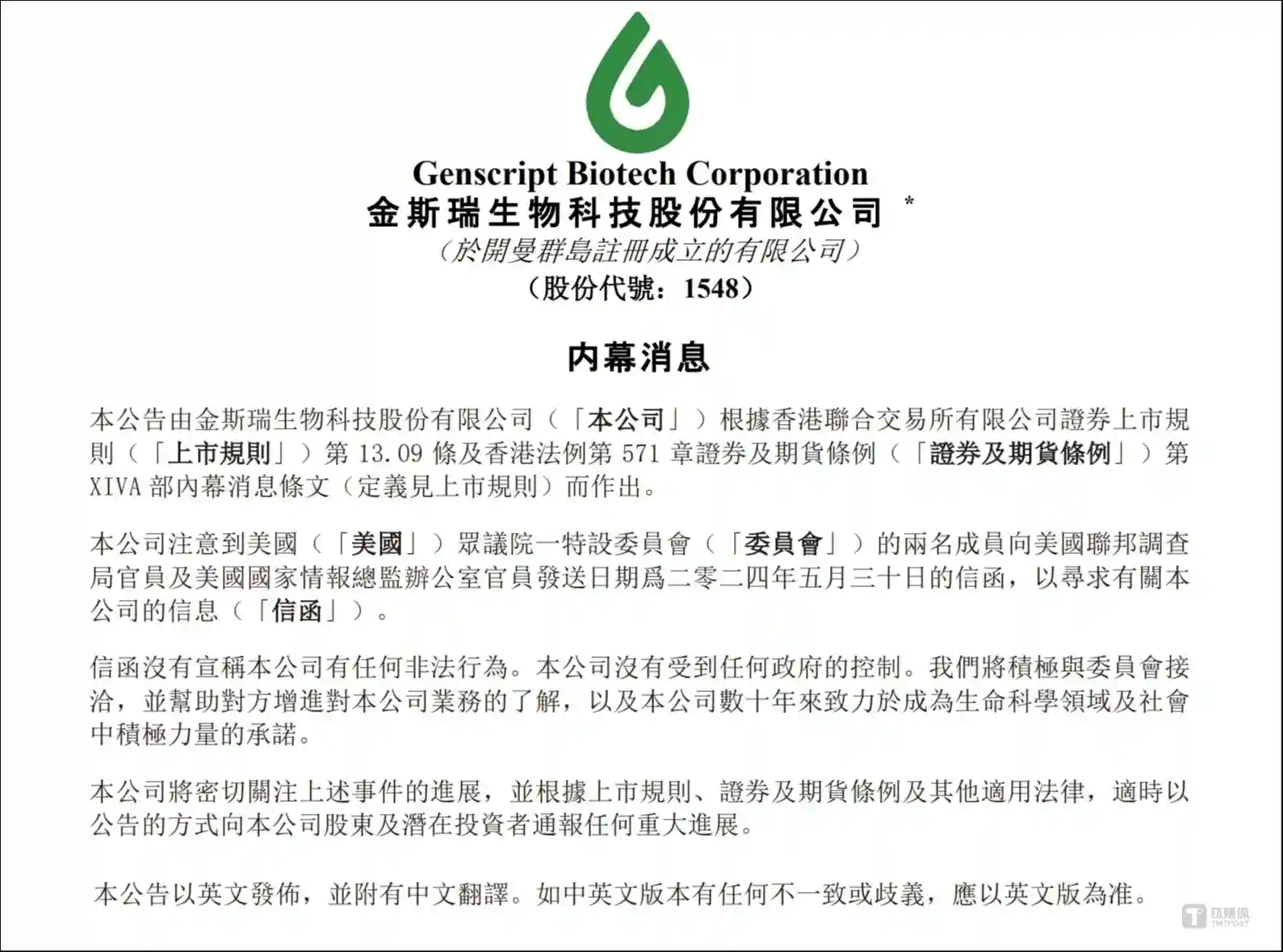 同时,信函中还提到百斯杰(Bestzyme)、传奇生物(LegBiotech)和金斯瑞蓬勃生物(ProBio)等三家金斯瑞旗下子公司的情况。